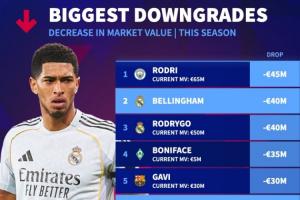 体育资讯03月31日讯 德转盘点了本赛季目前球员身价下跌榜,其中罗德里下降4500万欧最多,贝林、罗德里戈下降4000万欧。