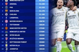 体育资讯4月2日讯 德国转会市场公布了新一期的俱乐部身价情况,皇马以13.4亿欧居首,曼城以13.1亿欧次之,阿森纳则以12.3亿欧位居第三。