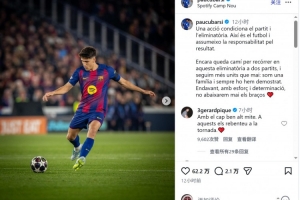 库巴西赛后社媒表示,自己为这场失利承担责任,巴萨传奇后卫皮克留言鼓励:“昂首挺胸,我的传奇,次回合你们就把他们打爆。”