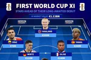 首次参加世界杯球员阵容(总价11.2亿欧)